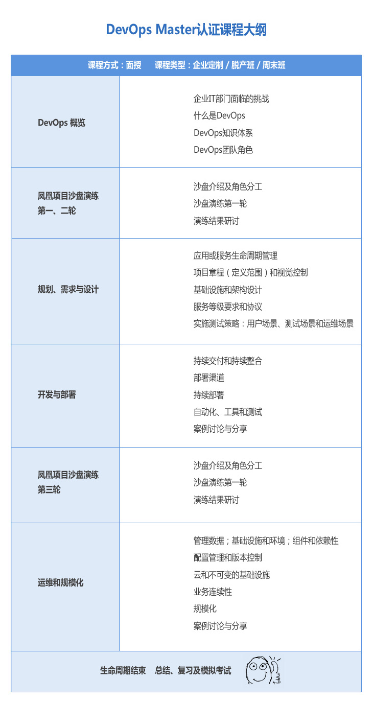 DevOps Master 是該領域第一個國際權威的專業(yè)認證。本課程將全面融合講師講授、案例討論與沙盤演練等多種培訓手段。在幫助學員系統(tǒng)化理解DevOps的理念與管理框架的同時,通過全球風行的鳳凰項目的沙盤演練,幫助學員切身體會如何在企業(yè)環(huán)境中構建DevOps文化,從而更好地與客戶互動,最終交付令人滿意的IT服務。