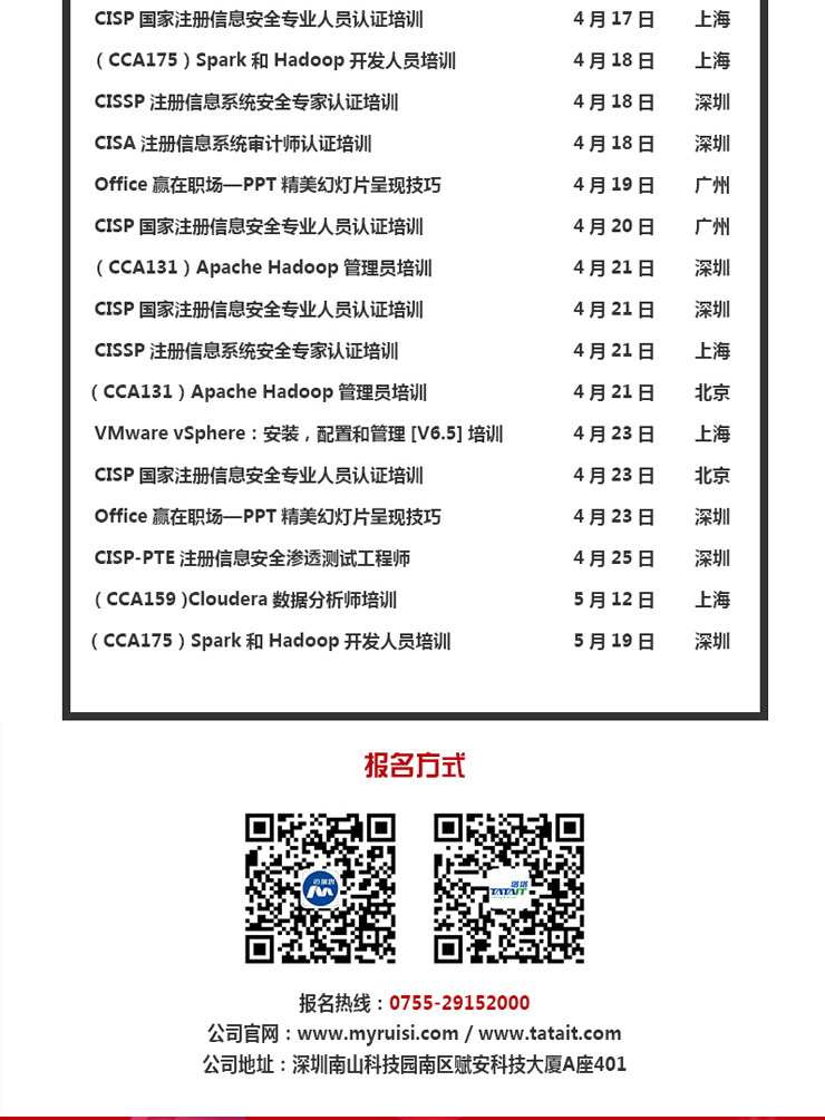 咨詢郵箱:tata@tatait.com 咨詢電話:0755-29152000 新浪微博:@塔塔IT 微信:添加公眾賬號“塔塔IT”加關(guān)注!塔塔IT為邁瑞思旗下子品牌,專注高端IT培訓(xùn)。